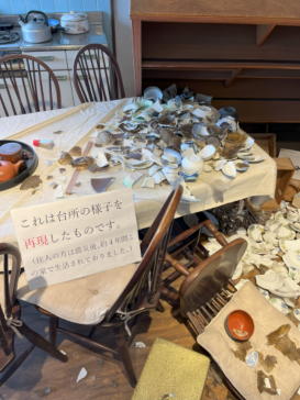 はじめは地震だとは思わず、ダンプカーがマンションに突っ込んで来たと思ったそうです。すぐに揺れがおさまったので、枕元のスリッパを履いて寝室のドアを開けようとしました。しかし開かないので、蹴破ってダイニングキッチンに出てみると、食器棚が倒れて食器が飛び出し、粉々に割れて床に散らばっていました。